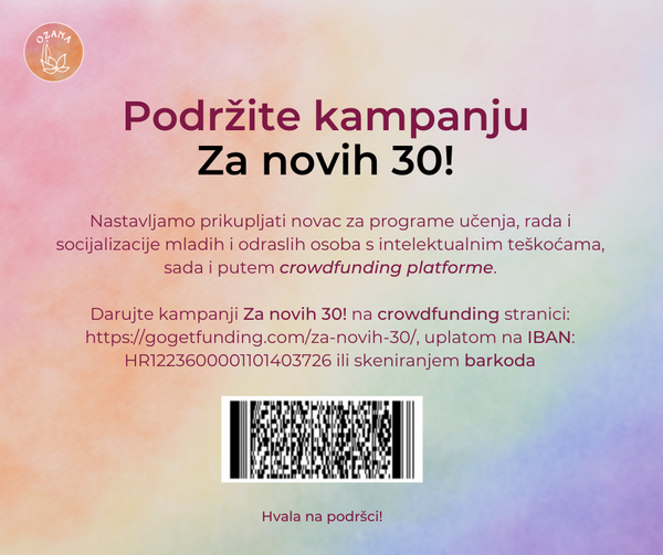 Pokrenuli smo kampanju na platformi Gogetfounding https://gogetfunding.com/za-novih-30 Putem crowfunding platforme cilj je prikupiti dodatna sredstva kako bismo mogli neometano nastaviti s radom i integracijom osoba s teškoćama u razvoju u naše društvo. Donirati možete putem stranice: https://gogetfunding.com/za-novih-30/, uplatom na IBAN: HR1223600001101403726, ili skeniranjem barkoda na dnu stranice: https://www.udruga-ozana.hr/podrzite-kampanju-za-novih-30/